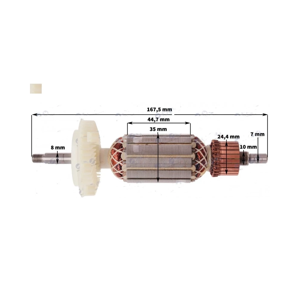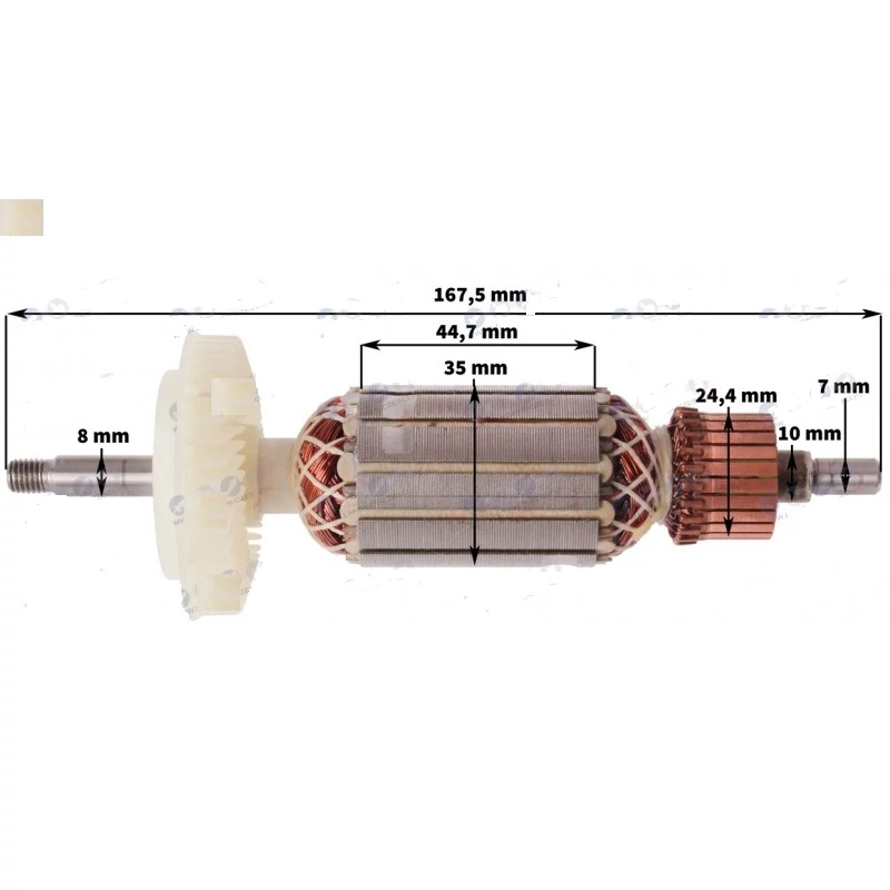 Teljes hossz: 167,5 mm Vasmag hossz: 44,7 mm Vasmag átmérő: 35 mm Kommutátor átmérő: 24,4 mm Első csapágyhely átmérő: 8 mm Hátsó csapágyhely átmérő: 7 mm