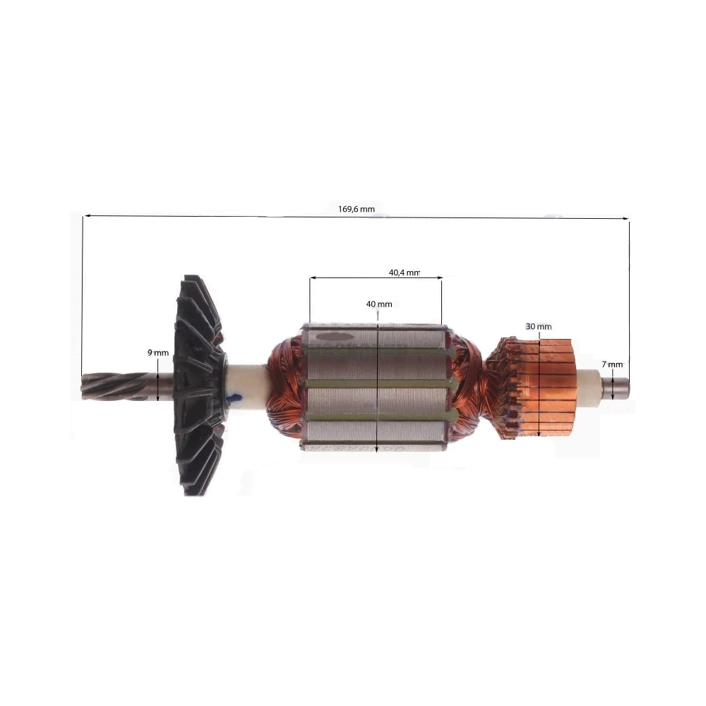 Teljes hossz: 169,6 mm Vasmag hossz: 40,4 mm Vasmag átmérő: 40 mm Kommutátor átmérő: 30 mm Első csapágyhely átmérő: 9 mm Hátsó csapágyhely átmérő: 7 mm