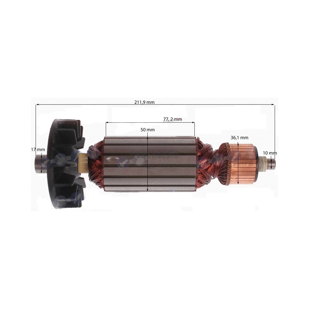 Teljes hossz: 211,9 mm Vasmag hossz: 77,2 mm Vasmag átmérő: 50 mm Kommutátor átmérő: 36,1 mm Első csapágy hely átmérő: 17 mm Hátsó csapágy hely átmérő: 10 mm