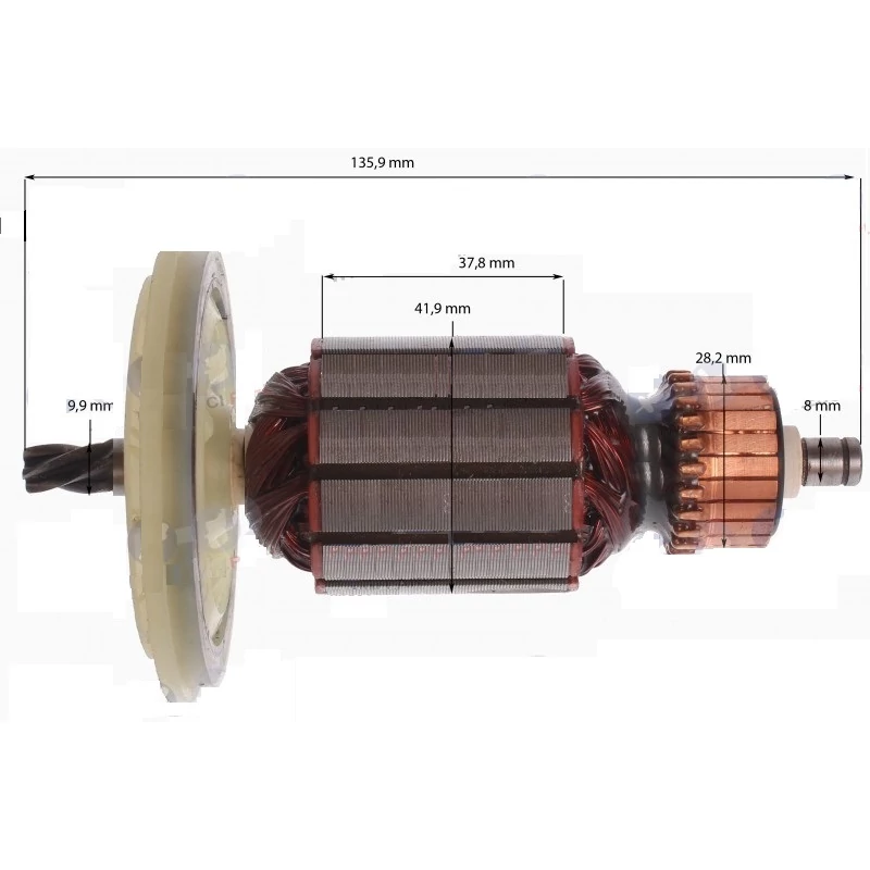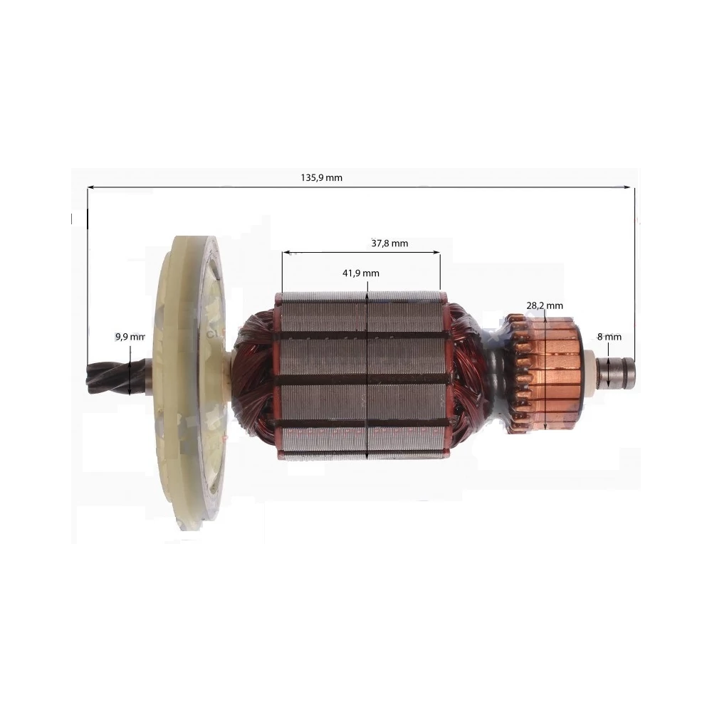 Teljes hossz: 135,9 mm Vasmag hossz: 37,8 mm Vasmag átmérő: 41,9 mm Kommutátor átmérő: 28,2 mm Első csapágy hely átmérő: 9,9 mm Hátsó csapágy hely átmérő: 8 mm