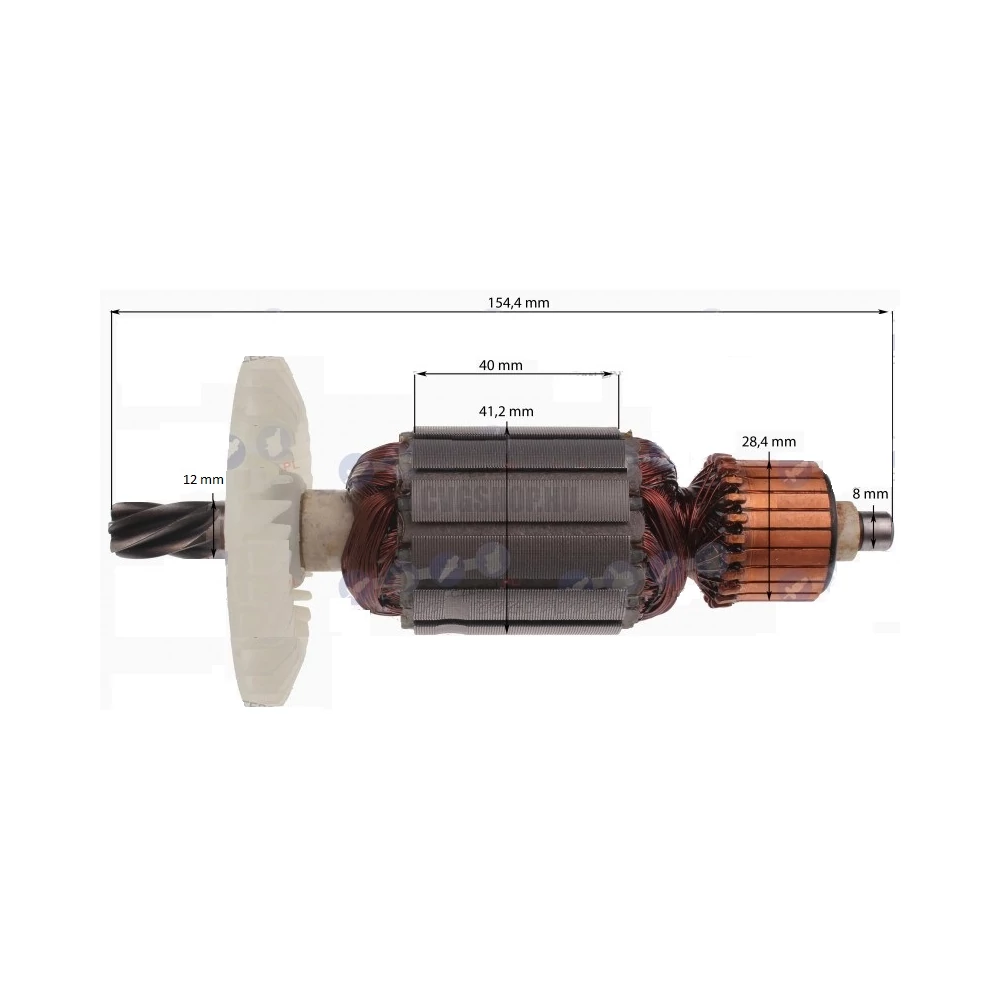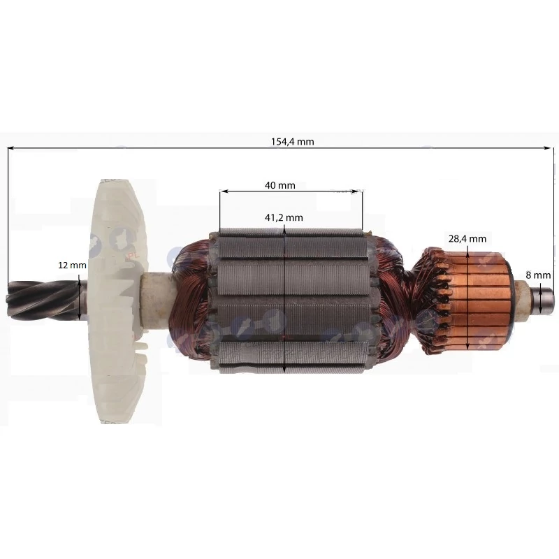Teljes hossz: 154,4 mm Vasmag hossz: 40 mm Vasmag átmérő: 41,2 mm Kommutátor átmérő: 28,4 mm Első csapágy hely átmérő: 12 mm Hátsó csapágy hely átmérő: 8 mm