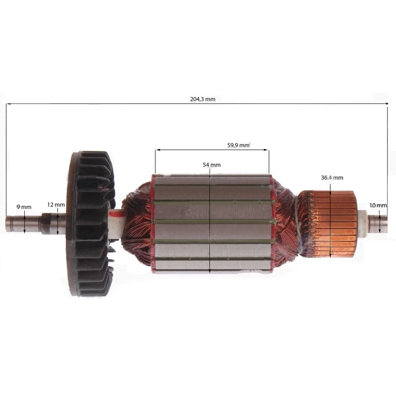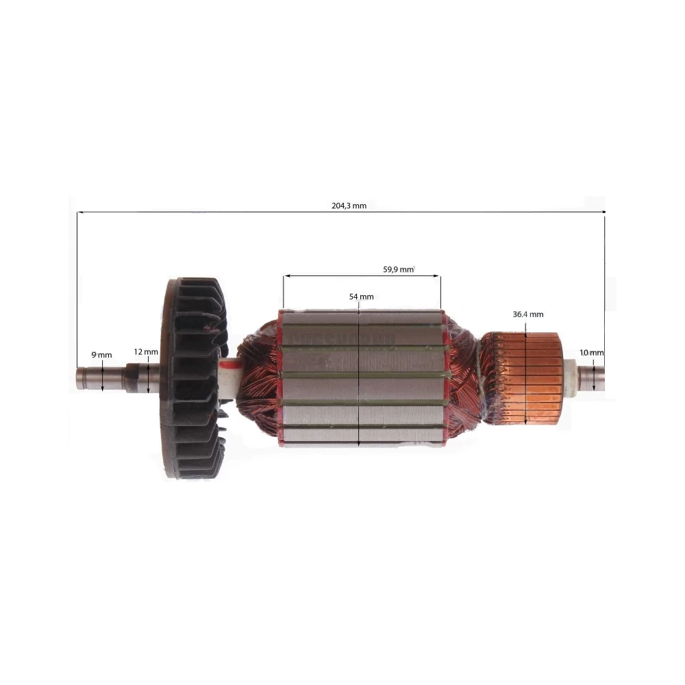 Teljes hossz: 204,3mm Vasmag hossz: 59,9 mm Vasmag átmérő: 54 mm Kommutátor átmérő: 36,4 mm Első csapágyhely átmérő: 12 mm Hátsó csapágyhely átmérő: 10 mm
