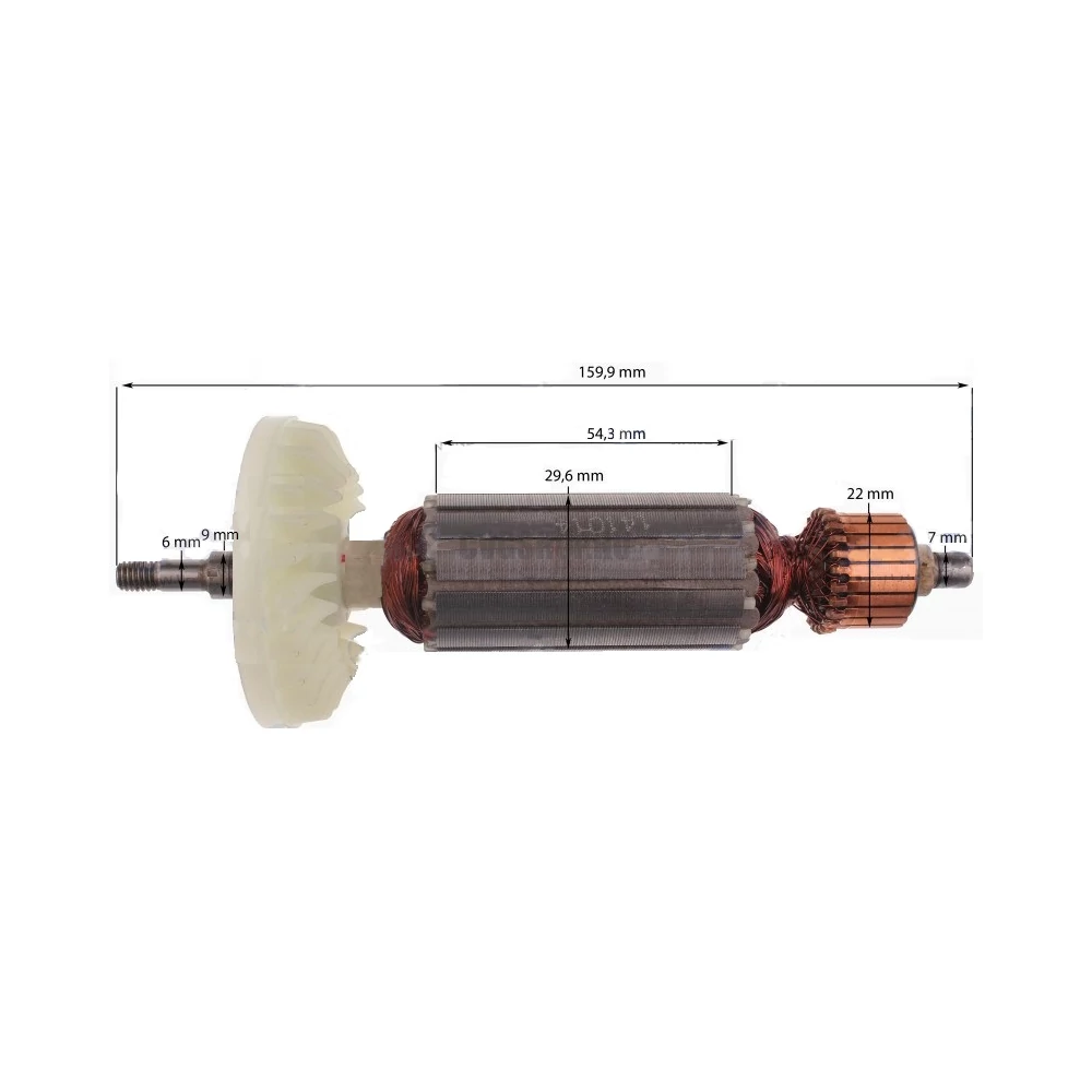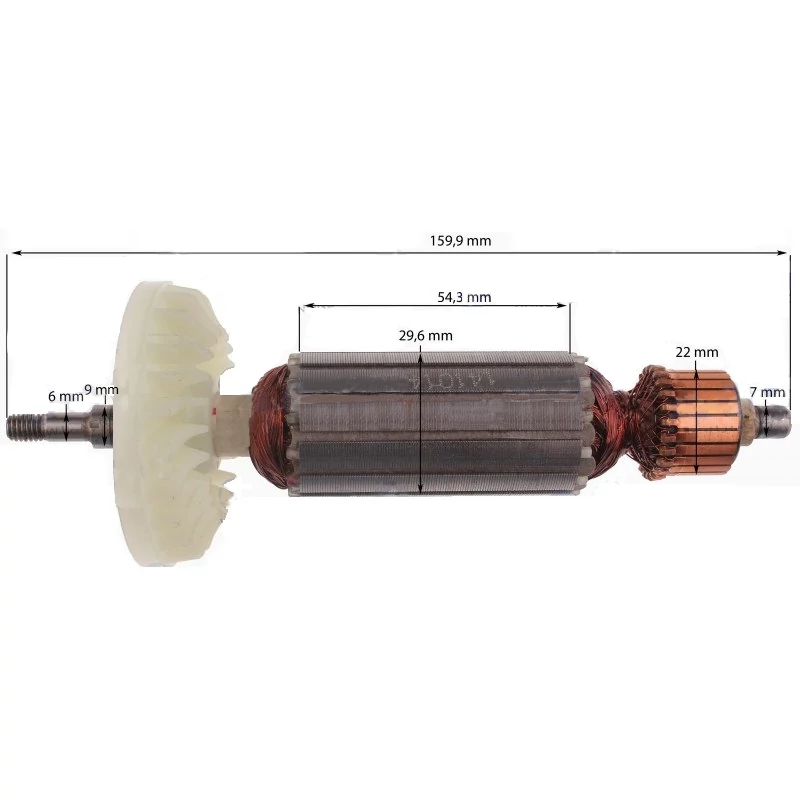 Teljes hossz: 159,9 mm Vasmag hossz: 54,3 mm Vasmag átmérő: 29,6 mm Kommutátor átmérő: 22 mm Első csapágyhely átmérő: 9 mm Hátsó csapágyhely átmérő: 7 mm