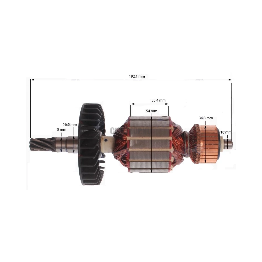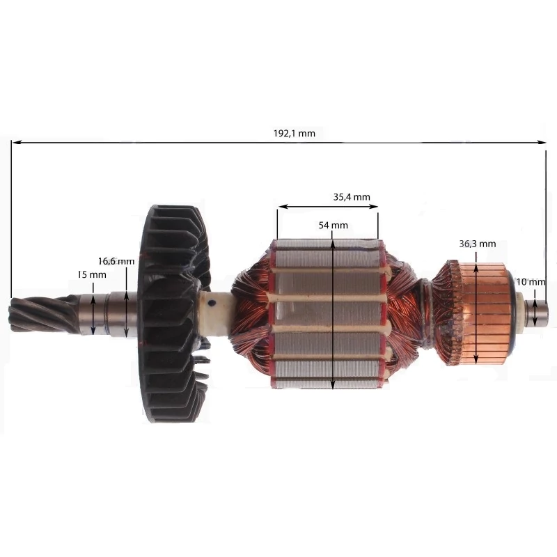 Teljes hossz: 192,1 mm Vasmag hossz: 35,4 mm Vasmag átmérő: 54 mm Kommutátor átmérő: 36,3 mm Első csapágyhely átmérő: 16,6 mm Hátsó csapágyhely átmérő: 10 mm