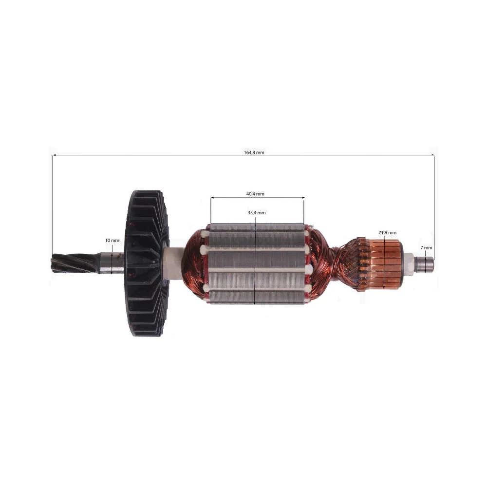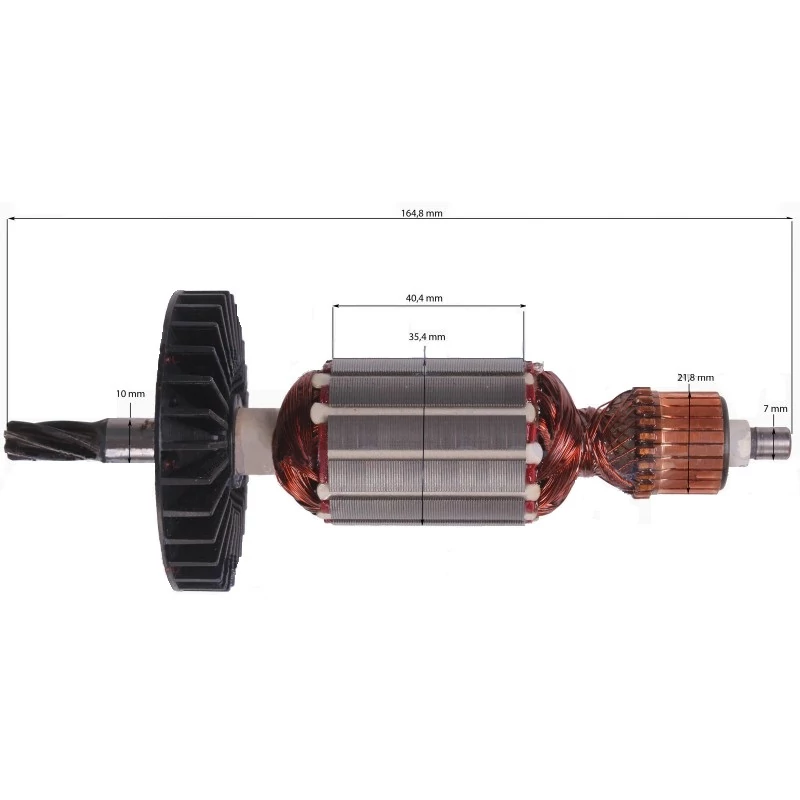 Teljes hossz: 164,8 mm Vasmag hossz: 40,4 mm Vasmag átmérő: 35,4 mm Kommutátor átmérő: 21,8 mm Első csapágyhely átmérő: 10 mm Hátsó csapágyhely átmérő: 7 mm