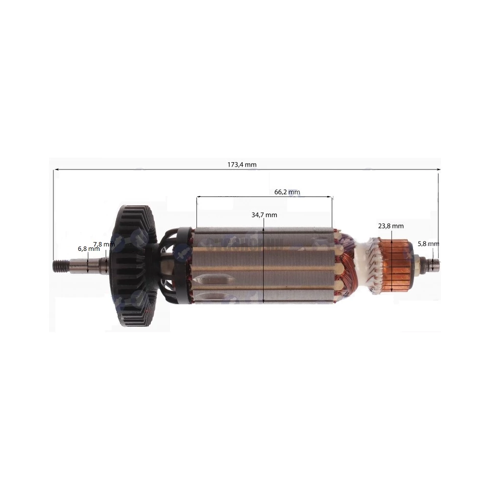 Teljes hossz: 173,4 mm Vasmag hossz: 66,2 mm Vasmag átmérő: 34,7 mm Kommutátor átmérő: 23,8 mm Első csapágy hely átmérő: 7,8 mm Hátsó csapágy hely átmérő: 5,8 mm